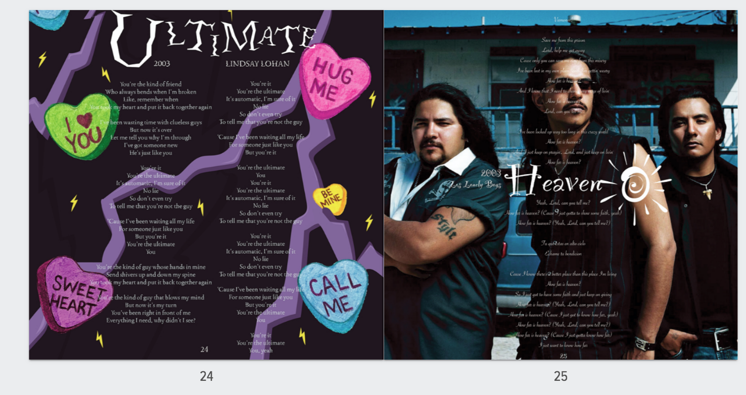 This is a 36-page, 10”x10” illustrated lyrics book I designed and produced as a personal gift. I originally got the inspiration for this project after viewing and flipping through the most recent Beatles Illustrated Lyrics Book. I aimed to design its pages in different styles to try and emulate the massive range of style in music.